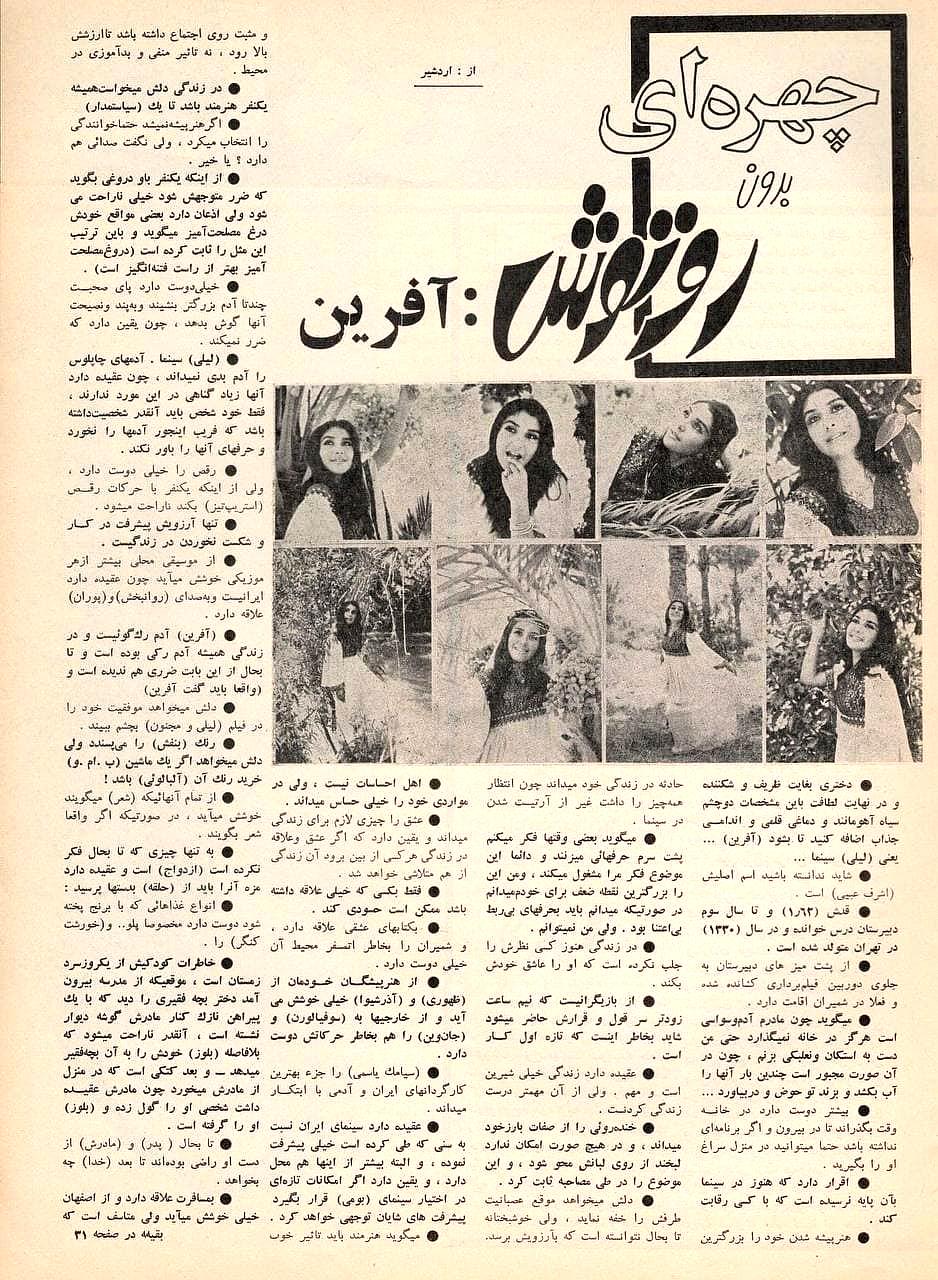 ”آفرین،“ فیلم و هنر، شماره ۲۶۲ (سال ششم ۲۱ آبان ۱۳۴۸): ۱۴.