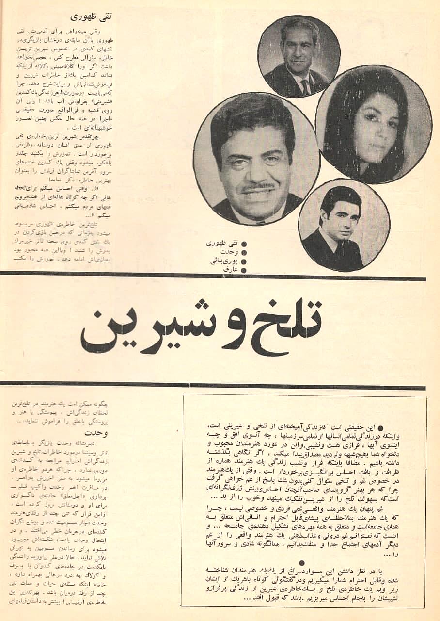 ”تلخ و شیرین،“ فیلم و هنر، شماره ۲۶۹ (سال ششم ۱۰ دی ۱۳۴۸): ۱۶.