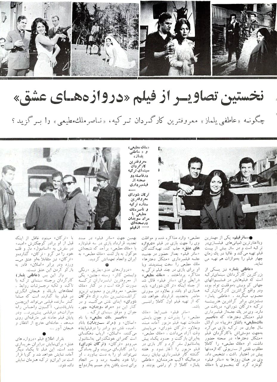”نخستین تصاویر از فیلم دروازه‌های عشق،“ فیلم و هنر، شماره ۲۶۶ (سال ششم ۱۹ آذر ۱۳۴۸): ۱۹.