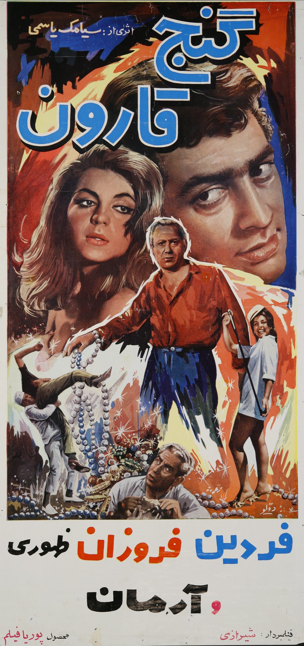 Figure 6: The poster for Qārūn’s Treasure (Ganj-i Qārūn). The inscription reads: “Qārūn’s Treasure, directed by Siyāmak Yāsamī, produced by Pūriyā Film,” followed by the names of the principal actors.