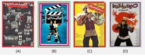 Figure 10: Four posters from the Samad comedy franchise, directed by Parvīz Sayyād: (A) Samad bih Madrasah Mīravad (Samad Goes to the School, 1973). (B) Samad Ārtīst Mīshavad (Samad Becomes an Artist, 1974). (C) Samad Khushbakht Mīshavad (Samad Becomes Fortunate, 1975). (D) Samad dar Rāh-i Izhdahā (Samad in the Way of the Dragon, 1977).