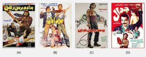 In addition to comedy films, movies in the crime and action genres have also made deliberate use of poster design to convey their genre and themes. A closer examination of these posters reveals that facial expressions and body gestures of the characters serve as key visual elements in constructing what can be called a thematic scene (Figure 12). By “thematic scene,” I refer to a condensed, emblematic representation of the film’s core emotional and narrative conflict — a moment that does not merely depict an event from the film but symbolically encapsulates its moral atmosphere and dramatic tension. For instance, in the poster for Bih Dādam Biras Rafīq (Help Me Friend, 1978) — a thriller dealing with prostitution and revenge — a woman’s blood-covered body dominates the foreground, while two male figures are positioned behind her with fearful facial expressions and gestures that suggest they are prepared for physical confrontation (Figure 12-A). This visual composition goes beyond mere representation; it evokes a sense of urgency, danger, and unresolved conflict that defines the film’s mood and storyline. Such gestures of readiness for violence, repeated across many posters of crime and action films, are not just aesthetic choices but meaningful signifiers. They communicate the central conflict and emotional intensity of the narrative. The spatial arrangement of figures and their expressions works together to construct a visual shorthand for the film’s world, effectively turning the poster into a narrative and thematic synopsis.