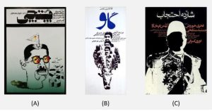 Figure 17: Movie posters designed by Farshīd Misqālī: (A) Pustchī (The Postman), directed by Dāryūsh Mihrjūyī, 1972. (B) Gāv (The Cow), directed by Dāryūsh Mihrjūyī, 1969. (C) Shāzdah Ihtijāb (Prince Ehtejab), directed by Bahman Farmānārā, 1974.