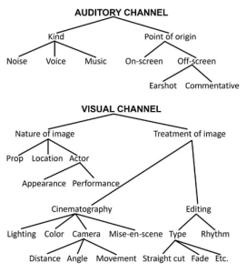 Figure 7: Cinematic narrative tools in auditory and visual channel in films.[mfn]Seymour Chatman, Coming to terms: The Rhetoric of Narrative in Fiction and Film (Cornell University Press, 1990), 135.[/mfn]