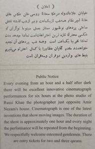 Figure 1: Advertisement for the first film exhibition in Iran, published in the second issue of Habl al-Matīn newspaper, September 1907.[mfn]Mas‛ūd Mihrābī, Sad sāl I‘lān va Pustir-i fīlm dar Īrān (Tehran: Nazar, 2011), 18.[/mfn]