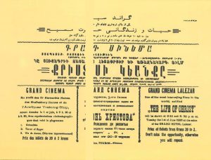 Since 1925, following the resumption of film screenings in Iran (which had been stopped since 1911 due to various reasons, including the Jungle Movement of Gīlān, the fall of the Qājār Dynasty, the First World War, and the 1917 Russian Revolution) lithographic and movable printed posters for foreign films gained popularity, now featuring illustrations from the film. Published in immigrant cities of Iran such as Tehran, Rasht, and Tabriz, these posters were often printed in three languages: Persian, Russian, and French, and sometimes Armenian and English. One interesting example of multilingualism in movie posters is found in the advertisement for the screening of the movie The Birth, the Life and the Death of Christ (Hayāt va Zindaganī-i Hazrat-i Masīh, 1906) at the Grand Cinema of Tehran in 1926. The poster of this film was presented in 5 languages (Figure 3).