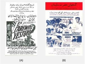 Figure 5: (A) Persian poster for Farewell to Yesterday (Vidā‛ az Guzashtah, 1950). (B) Poster for King Solomon’s Mines (Ganj’hā-yi Hazrat-i Sulaymān, 1950), featuring a mixture of Farsi calligraphy and printed words added to the original poster.[mfn]Mas‛ūd Mihrābī, Sad sāl I‘lān va Pustir-i fīlm dar Īrān (Tehran: Nazar, 2011), 54, 55.[/mfn]