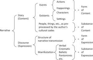 In other words, Chatman states that the story is the “content level” of the narrative while the discourse is its “expressive level”. The discourse determines which events should be narrated and which should not, whether they should be presented in chronological order or through reverse narration. It shapes the overall form of the narration.