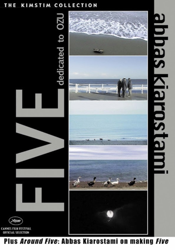 Figure 8: DVD cover of Five: Dedicated to Ozu (2003), directed by ‛Abbās Kiarostami, released as part of The KimStim Collection. The composite image shows five key shots from the film: the sea, passing figures, ducks, and the moon reflected on water. (Source: The KimStim Collection, DVD cover)