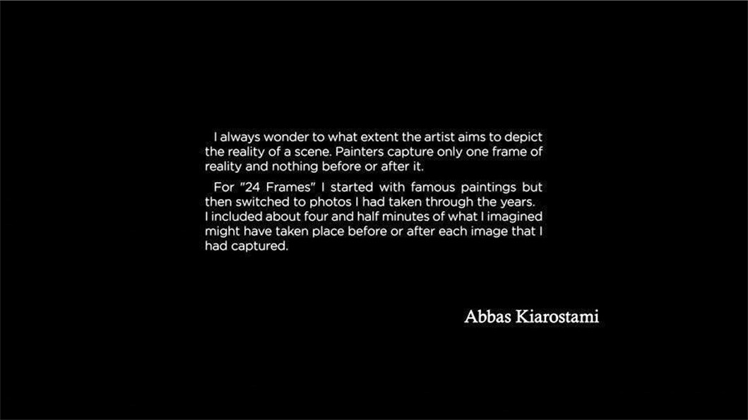 Figure 9: The opening frame of ‛Abbās Kiarostami’s 24 Frames (2017) displays the director’s own statement. In this reflective note, Kiarostami questions the extent to which an artist can capture reality, emphasizing that painters only depict a single frame and omit what comes before or after. He explains that 24 Frames emerged from his imagination of the moments surrounding still images he had collected over the years.