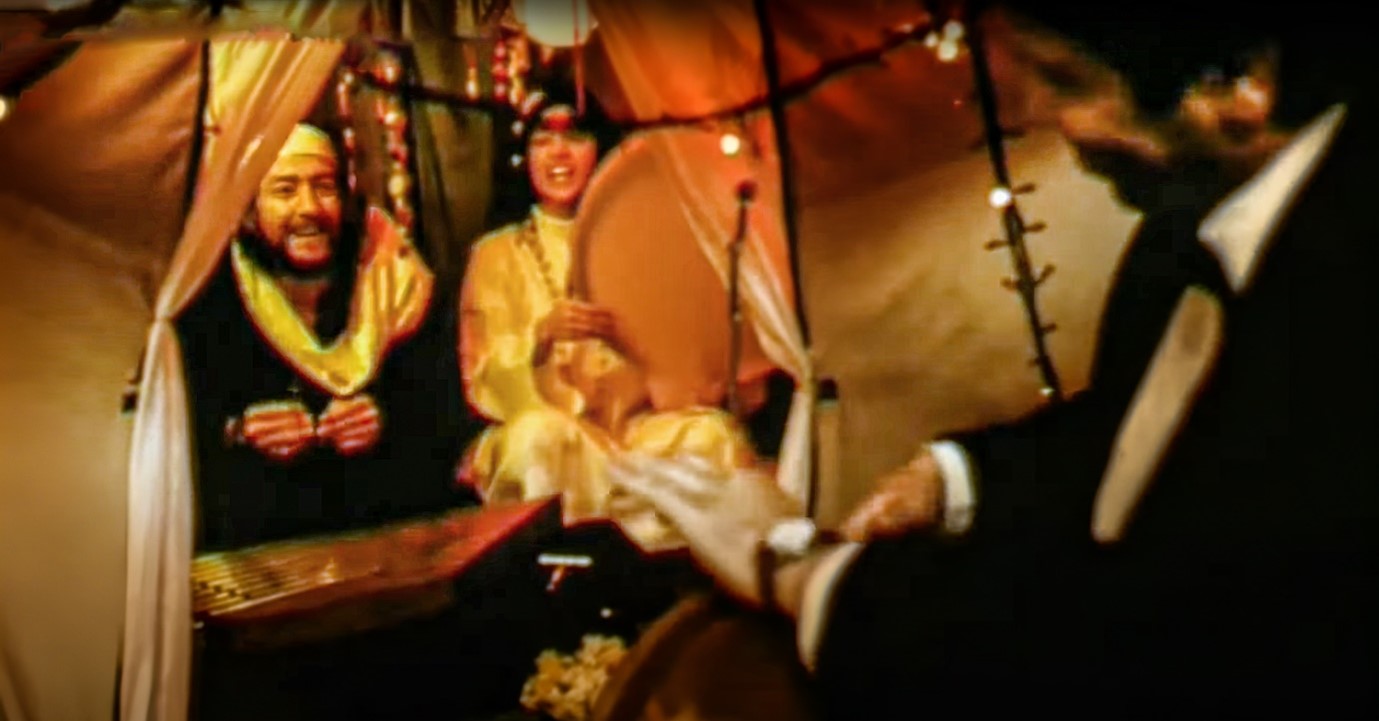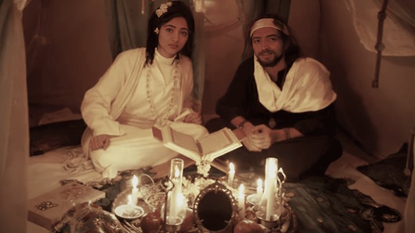 Even the marriage proposal departs from tradition. Estranged from his family due to his professional pursuit of music, ‛Alī visits Hāniyah’s family home alone, without the customary accompaniment of relatives. The subsequent ‛aqd ceremony is similarly unconventional, taking place at ‛Alī’s home. A clergyman rings the doorbell and is greeted by one of ‛Alī’s friends, while the bride and groom sit together in a small tent on the balcony. Their sufrah-yi ‘aqd is reduced to a modest tray containing only a few symbolic items. Absent are the traditional audience, the sugar-grinding ritual, and the feminine mediators to typically facilitate the bride’s transition into wifehood.