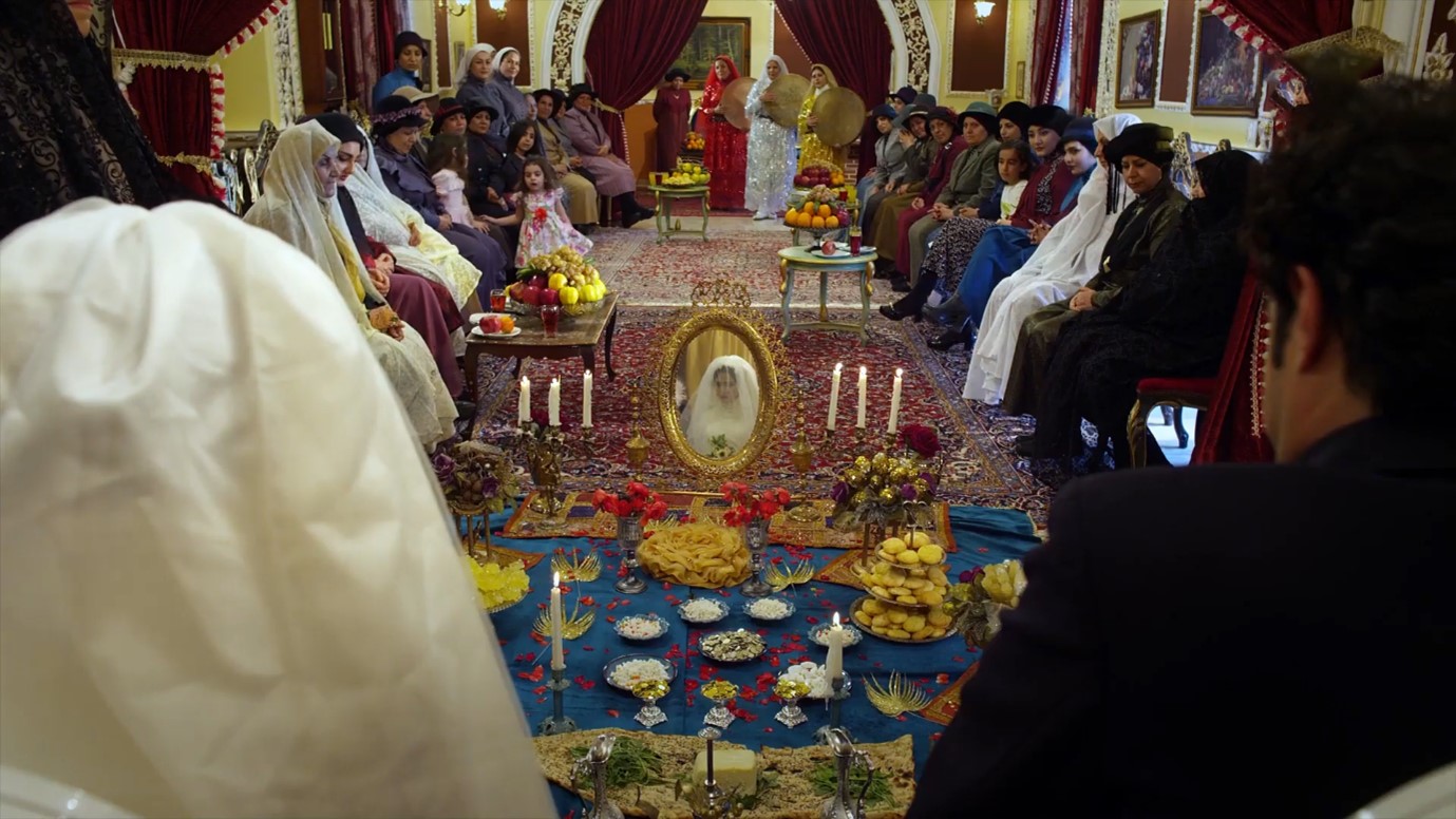 The ‛aqd (marriage contract) scene between Shahrzād and Qubād unfolds in a room filled with women. Some make celebratory kil (ululation) sounds, others play the daf (a traditional frame drum), while the rest clap rhythmically. The spatial arrangement mirrors familiar Iranian wedding settings. A decorative cloth (sufrah-yi ‘aqd) is spread on the floor, with two chairs placed before it for the bride and groom. This sufrah is adorned with symbolic items meant to bestow blessings of prosperity, fertility, and sweetness upon the couple, such as a mirror and candlesticks, sangak bread, walnuts, eggs, and a Qur’an. The visual symmetry of the scene, emphasizing paired elements, reinforces the notion of the marital union. As the groom enters, the ambient sounds pause, and a woman announces his arrival. Shahrzād, seated and veiled in gauze, awaits the ceremony’s commencement. Her mother urges the others to bring in the clergyman quickly, emphasizing the cultural belief in the importance of auspicious timing. At this moment Shahrzād’s sister asks any widowed or divorced women to leave the room, reflecting a superstition that they may bring misfortune to the marriage. Once the clergyman arrives, four women begin the sugar cone grinding ritual. Two hold gauze above the couple’s heads, while the other two—typically unmarried women—grind decorated sugar cones over the fabric, symbolizing the wish for a sweet and blessed union. The clergyman recites the proposal three times. Because this is Shahrzād’s first marriage, she is referred to as Dūshīzah (maiden), emphasizing cultural norms surrounding virginity. He states: “… am I authorized by you, with the permission of your father and the elders present, to bind you in permanent and eternal marriage to Mr. …, with the agreed-upon dowry and conditions?”27Shahrzād, dir., Hasan Fathī (Sīmā Film, Iran, 2015), 0:13:33- 0:13:50. After the first recitation, one woman holding the gauze responds, “The bride has gone to pick flowers.” The second time, another says, “The bride has gone to bring rosewater.” On the third recitation, Shahrzād reluctantly responds: “With the permission of my father and the elders present, yes.” At that moment, the sugar-cone grinding stops, the gauze is removed, and the celebratory sounds resume. Simultaneously, Qubād lifts the veil from Shahrzād’s face, seeing her unveiled for the first time.