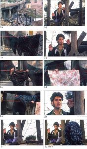 The first shot of this scene shows Rayhānah’s mother from a distance in a very long shot, hanging laundry on the roof of her house, which is positioned at the same level as the highway and the bridge. In this frame, she is obscured behind barbed wire (2-a). The following shot shifts to Nazar, approaching the barbed wire in a medium shot (2-b). The rest of the scene continues to depict Rayhānah’s mother from behind the laundry, as she engages in dialogue with Nazar, who is framed in medium close-up and close-up shots, still positioned behind the barbed wire (2-c to 2-h). The final shot of this sequence spatially positions Nazar and Rayhānah’s mother together in one frame. In a medium over-the-shoulder shot, Nazar is initially framed alone on the left (2-i), and after a moment, Rayhānah’s mother enters the frame from the right side, her face turned away from the camera (2-j cont’d). Throughout this shot, Nazar remains the primary subject, maintaining visual dominance until the scene concludes.