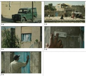 A‛lā’s entry into Fīrūzah’s feminized space does not occur immediately; rather, it is mediated through a deferring gaze. The director underscores this separation by highlighting the act of pressing the doorbell in a deliberate insert shot (3-d), which is then followed by a medium shot of A‛lā knocking on the door (3-e). These choices deliberately delay the narrative progression and reinforce the spatial and symbolic separation between A‛lā and Fīrūzah.