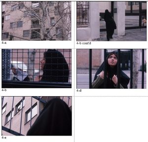While the last analyzed scene incorporates all three forms of buttressing gaze, it still maintains Rayhānah’s mother as fully veiled. A similar scene appears in Beautiful City, where Fīrūzah, Akbar’s sister, and her home are introduced for the first time (Figure 3). However, unlike the previous scene, this one does not employ a full-covering gaze. Instead, it creates a mediating gaze, which defers Fīrūzah’s presence, keeping her visually distant and obscured.