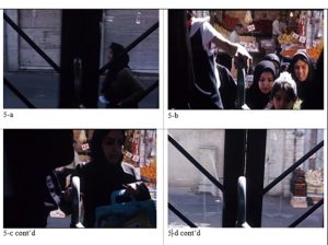 In one scene from Beautiful City (Figures 3 and 7), no one answers the door. Fīrūzah’s ex-husband, seated in a kiosk separated from her house by a barred window (7-a), tells A‛lā that she is not home. After A‛lā buys a drink, Fīrūzah opens the door when her baby, left by his father, crying (7-b). While taking her child inside, she scolds the father his negligence. When A‛lā asks if she is Akbar’s sister, her ex-husband attempts to interject, asserting that no one can enter without his permission. However, the film makes clear that Fīrūzah has agency and controls the boundaries of her private sphere.