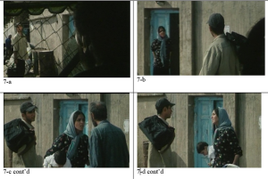 In a three-shot sequence involving Fīrūzah and the two men, she is positioned between them, engaging in a verbal confrontation with her ex-husband, telling him that the situation has nothing to do with him (7-c cont’d). In the same shot, she forces him to return to his kiosk, and the dialogue continues between her and A‛lā in a two-shot (7-d cont’d).