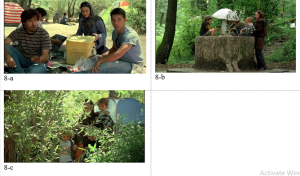 As in About Elly, the character of Elly herself is inconsequential. What matters is that her absence drives the narrative forward. Elly’s subjective perspective is effaced by the film, which aligns itself with the group’s gaze rather than hers. Elly is continually segregated from the rest of the group. While everyone gathers on the picnic mat (8-a), Elly tends to the children (8-b). When the group begins discussing the matchmaking purpose of the trip, each person shares their thoughts and judgments about Elly. As she returns to the group, she is framed through a mediating gaze, seen from behind a barrier of bushes.