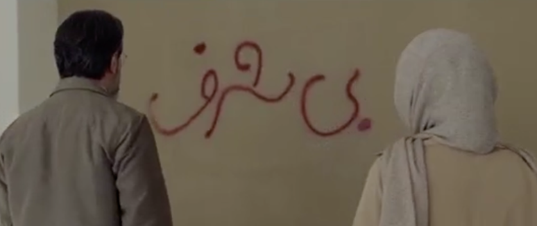 Figure 10: Slur written on the wall of Bihnām’s apartment. Still from At the End of the Night (Dar Intihā-yi Shab), directed by Āydā Panāhandah, 2024.