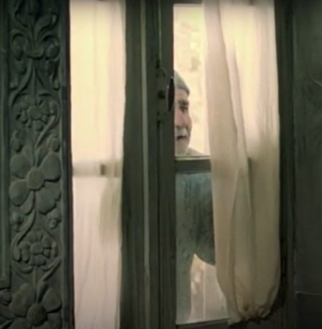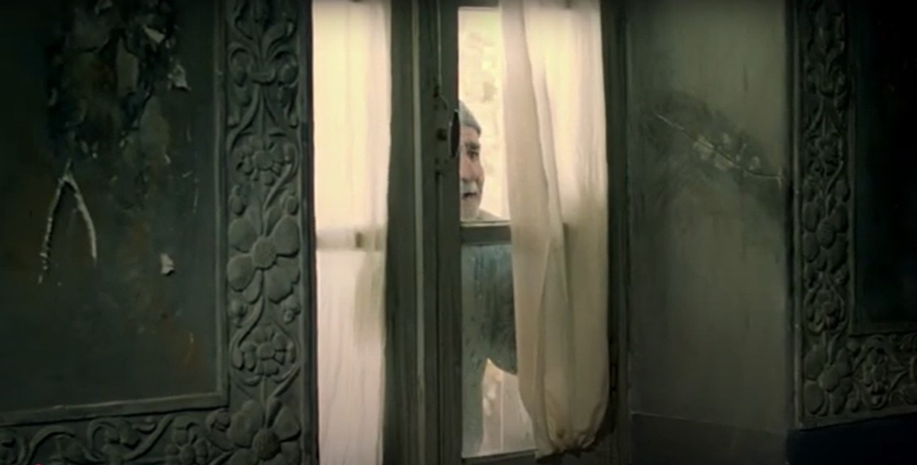 Figure 2-1: A medium shot of the gardener standing silently behind the window, framed by reflections of the garden, while Mahmūd sits inside absorbed in his thoughts. Still from The Pear Tree (Dirakht-i Gulābī), directed by Dāryūsh Mihrjūyī, 1998 (00:03:23).