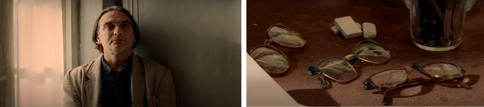 Figure 2-2: Mahmūd’s distracted wandering around the room (00:04:21) transitions to a shot of his cluttered desk (00:07:46), scattered with three pairs of glasses, erasers, cups, cigarette packs, and typewriters. Stills from The Pear Tree (Dirakht-i Gulābī), directed by Dāryūsh Mihrjūyī, 1998.