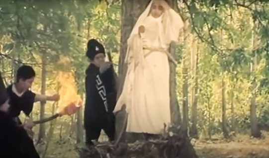 Figure 2-6: A childhood scene in the garden where “M” is play-acts as Joan of Arc, surrounded by children who pretend to burn her in playful imitation of martyrdom. Still from The Pear Tree (Dirakht-i Gulābī), directed by Dāryūsh Mihrjūyī, 1998 (01:22:25).