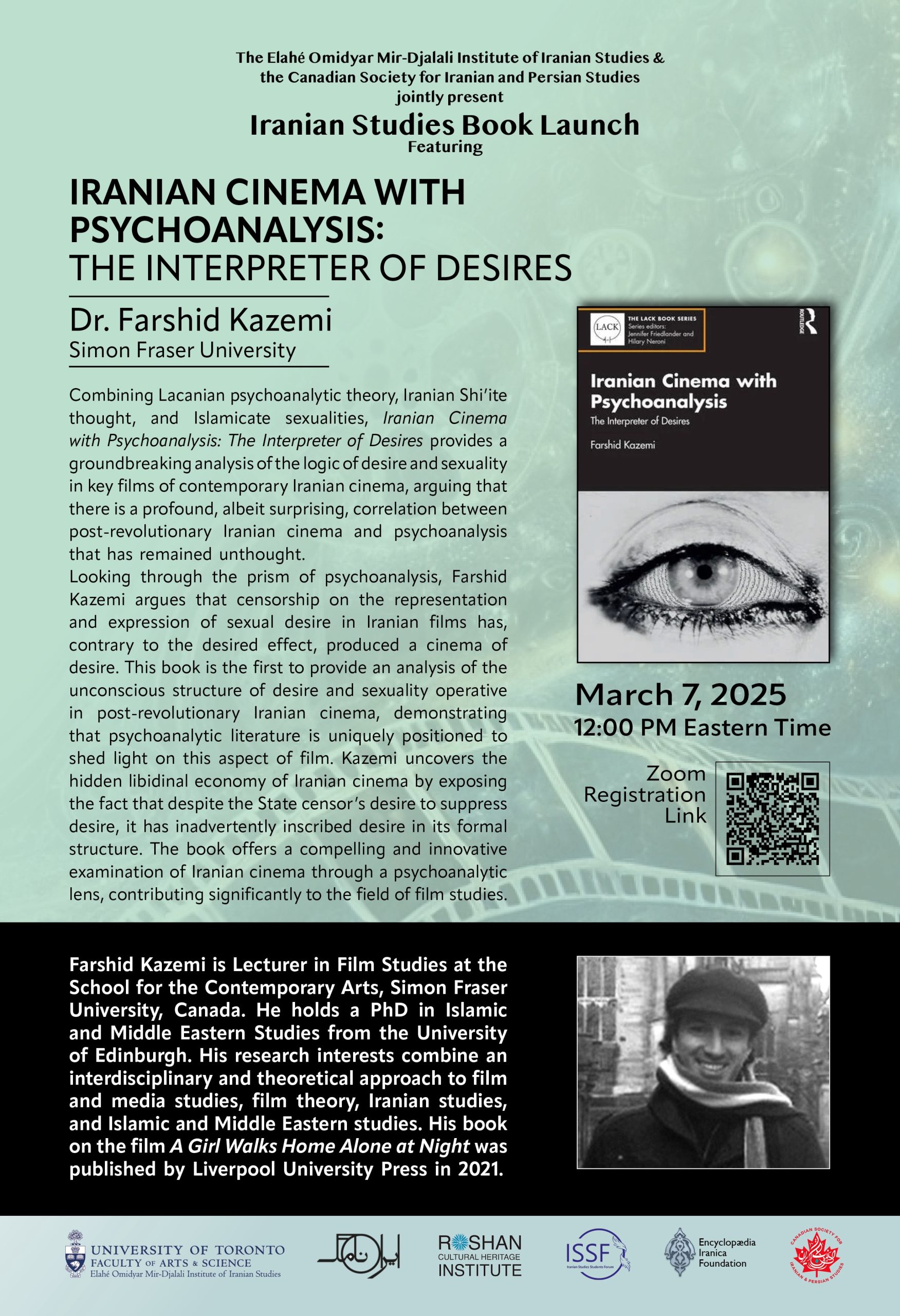 Farshid Kazemi is Lecturer in Film Studies at the School for the Contemporary Arts, Simon Fraser University. His research interests combine an interdisciplinary and theoretical approach to Film and Media Studies/Film Theory, Iranian Studies, and Islamic and Middle Eastern Studies. He holds a PhD in Islamic and Middle Eastern Studies from the University of Edinburgh, with a thesis on Iranian cinema and second wave psychoanalytic film theory. He has published several articles and book chapters on Iranian cinema, psychoanalytic film theory/feminist film theory in journals such as Camera Obscura. His book on the film A Girl Walks Home Alone At Night was published by Liverpool University Press in 2021.